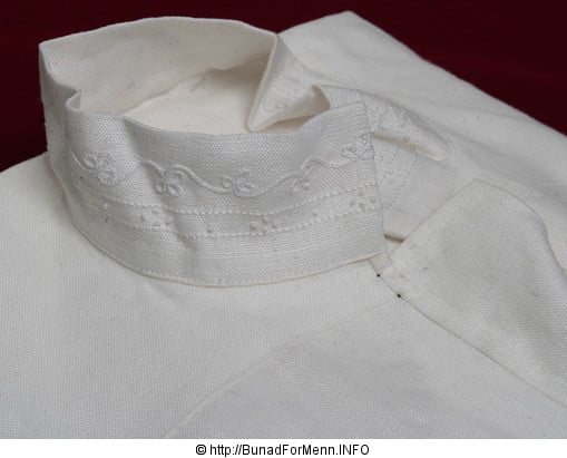 Den håndbroderte linskjorten til Akershus bunad til herre er laget av aller beste kvalitet. Dette er et lin som er lett å stryke og kan koke vaskes om du skulle være så uheldig å søle på skjorten. Det er viktig at skjorten er i lin da lin puster i motsetning til bomull. Mange tror fortsatt at lin er vanskelig å stryke og ikke kan vaskes i maskin. Dette er ikke riktig. Hvis man velger lin av høy kvalitet gir dette deg mange fordeler i forhold til en bomullsskjorte. Linskjorten er lett å stryke, kan vaskes i maskin i tillegg til at den puster slik at det ikke blir klamt og varmt å bruke bunaden. Vi pleier å si at linskjorter er varme om vinteren og svale om sommeren. De håndbroderte linskjortene er brodert på krage og mansjett i met mønster som er særegent for Akershus bunad til herre.
