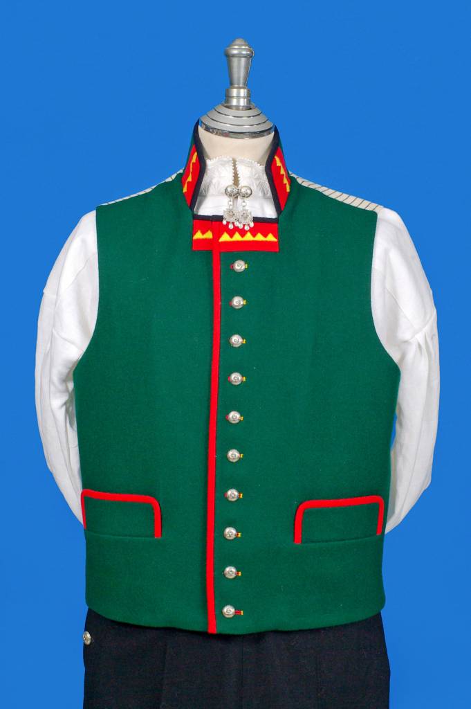 Grønn vest med rød krage og gult sikksakk mønster til bunad fra Sogn