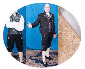 Vi kan levere komplett mannsbunad med jakke, bukse, vest, sølvknapper, mansjettknapper, halsnål, brodert linskjorte, strømper, hosebånd, silkesjerf, broderte bukseseler og bunadspose.