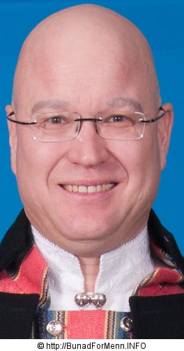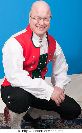 Komplett bunad med jakke, bukse, vest, sølvknapper, mansjettknapper, halsnål, brodert linskjorte, strømper, hosebånd, silkesjerf, broderte bukseseler og bunadspose. Pris fra kr 46.000,- Det eneste du mangler er sko.