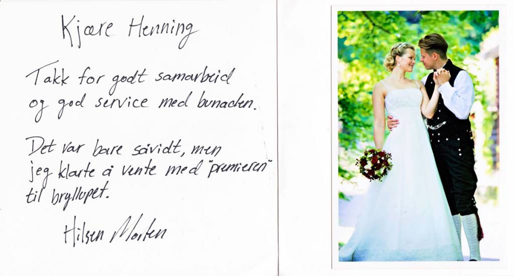 Kjære Henning Takk for godt samarbeid og god service med bunaden. Det var bare såvidt, men jeg klarte å vente med “premieren” til bryllupet. Hilsen Morten