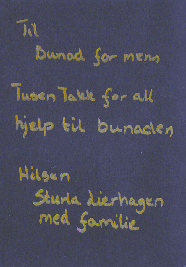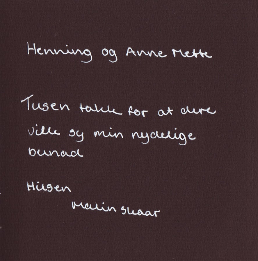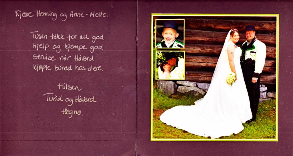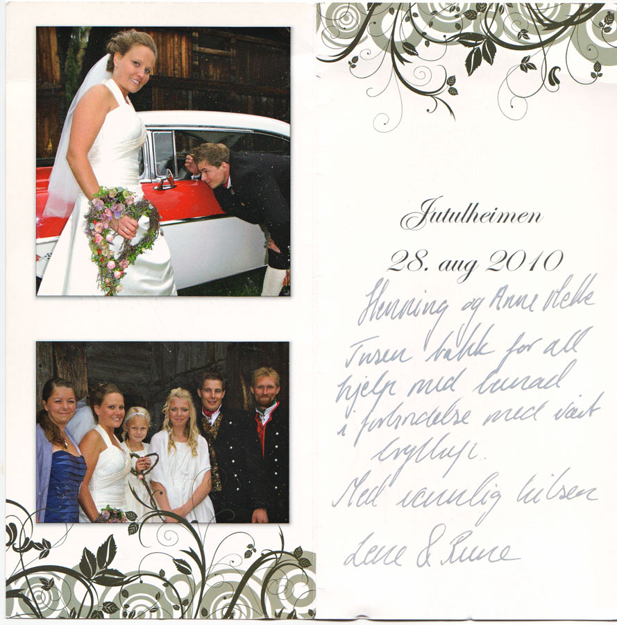 Jutulheimen 28. august 2010. Henning og Anne Mette. Tusen takk for all hjelp med bunad i forbindelse med vårt bryllup. Med vennlig hilsen Lene og Runde