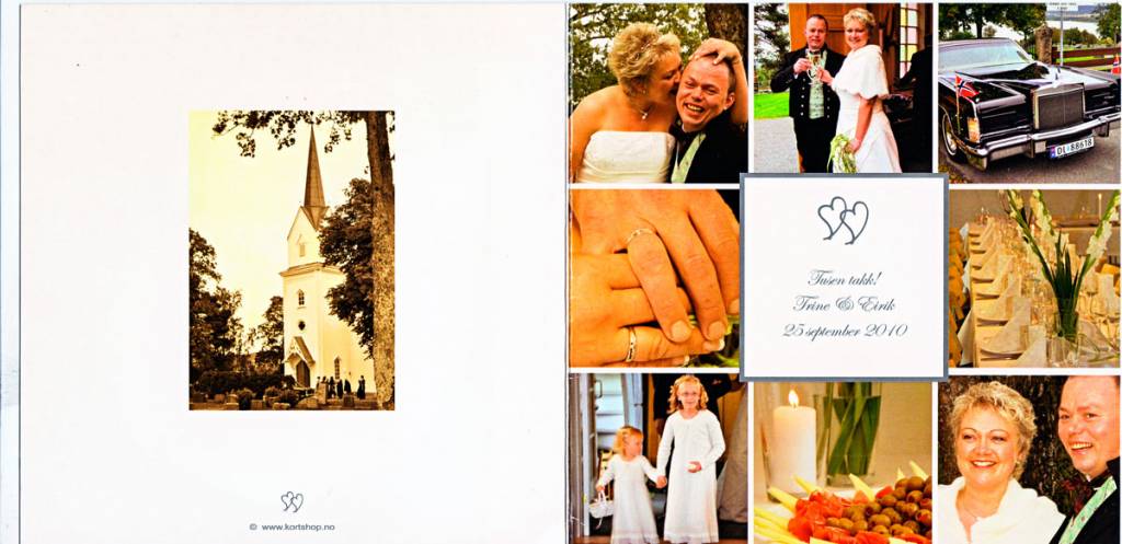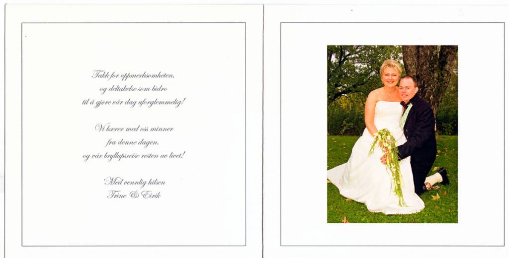 Takk for oppmerksomheten og deltagelse som bidro til å gjøre vår dag uforglemmelig! Vi bærer med oss minner fra denne dagen, og vår bryllupsreise resten av livet! Med venneligh hilsen Trine og Erik