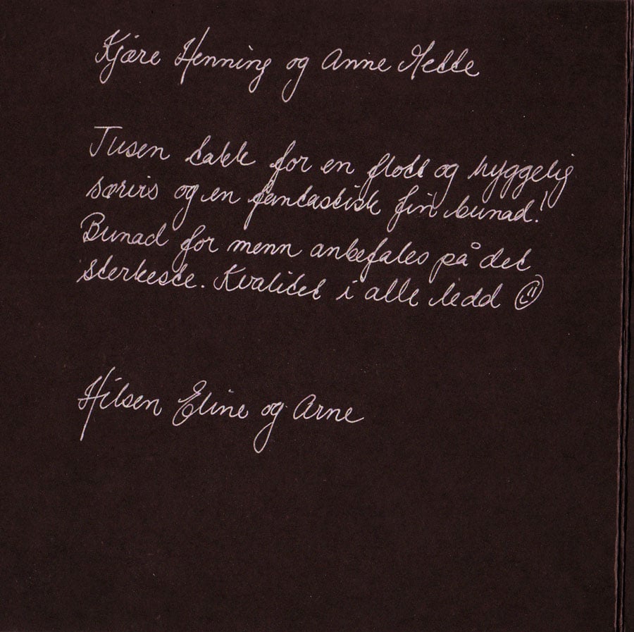 Kjære Henning og Anne-Mette Tusen takk for all god hjelp og kjempe god service når Håvard kjøpte bunad hos dere. Hilsen Turid og Håvard Hegna