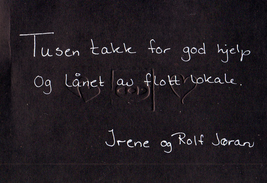 Tusen takk for god hjelp og lånet av flott lokale. Irene og Rolf Jaran