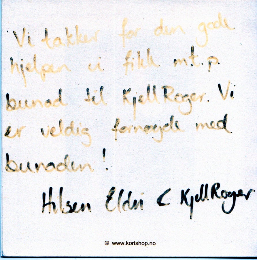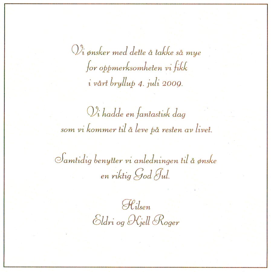 Vi ønsker med dette å takke så mye for oppmerksomheten vi fikk i vårt bryllup 4. juli 2009. Vi hadde en fantastisk dag som kommer til å leve på resten av livet. Samtidig benytter vi anledningen til å ønske en riktig God Jul. Hilsen Eldri og Kjell Roger.