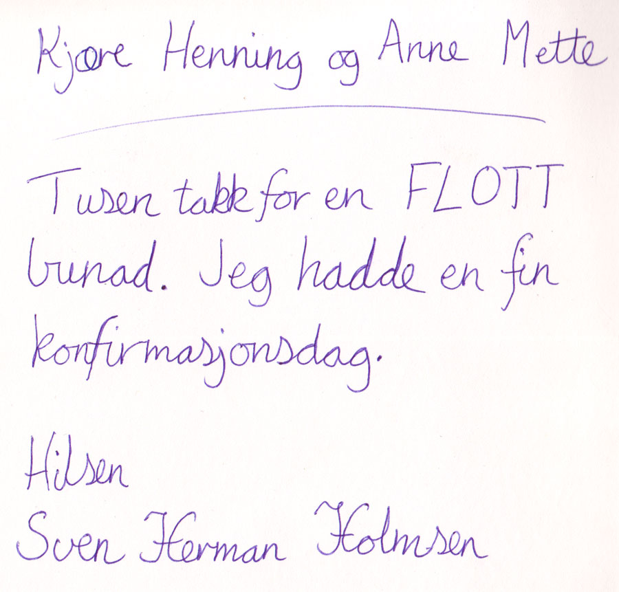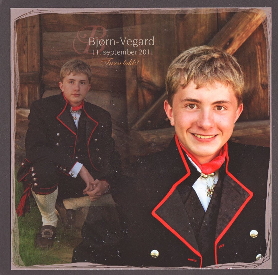 Kjære Henning og Anne Mette Tusen takk for en flott bunad. Jeg hadde en fin konfirmasjonsdag. Hilsen Sven Herman Holmsen