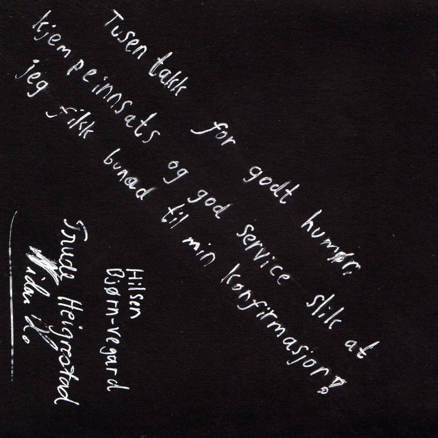 Tusen takk for godt humør, kjempeinnsats og god service slik at jeg fikk bunad til min konfirmasjon. Hilsen Bjørn-Vegard, Trude Heigrestad, Vidar LoTusen takk for gaven jeg fikk til konfirmasjonen min. Hilsen Jens Even