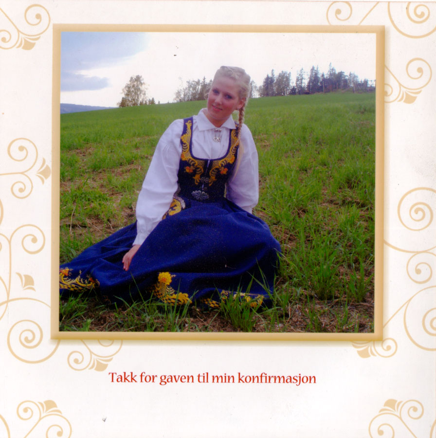 Henning og Anne Mette Tusen takk for at dere ville sy min nydelige bunad. Hilsen Malin SkaarTakk for gaven til min konfirmasjon.