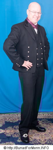 Komplett bunad med jakke, bukse, vest, sølvknapper, mansjettknapper, halsnål, brodert linskjorte, strømper, hosebånd, silkesjerf, broderte bukseseler og bunadspose. Pris fra kr 46.000,- Det eneste du mangler er sko.