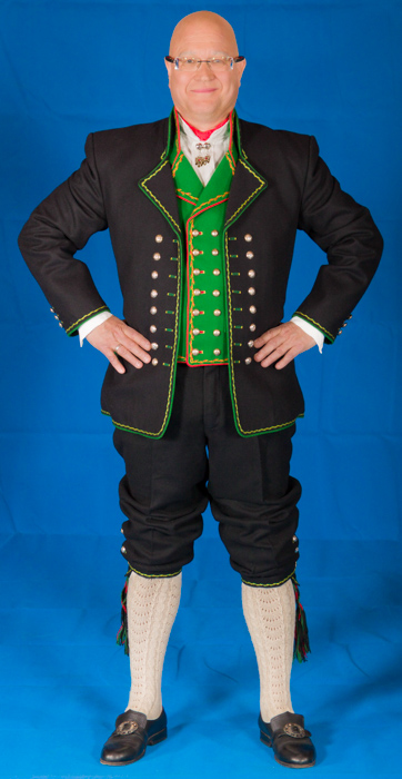 Komplett bunad med jakke, bukse, vest, sølvknapper, mansjettknapper, halsnål, brodert linskjorte, strømper, hosebånd, silkesjerf, broderte bukseseler og bunadspose. Pris fra kr 46.000,- Det eneste du mangler er sko.