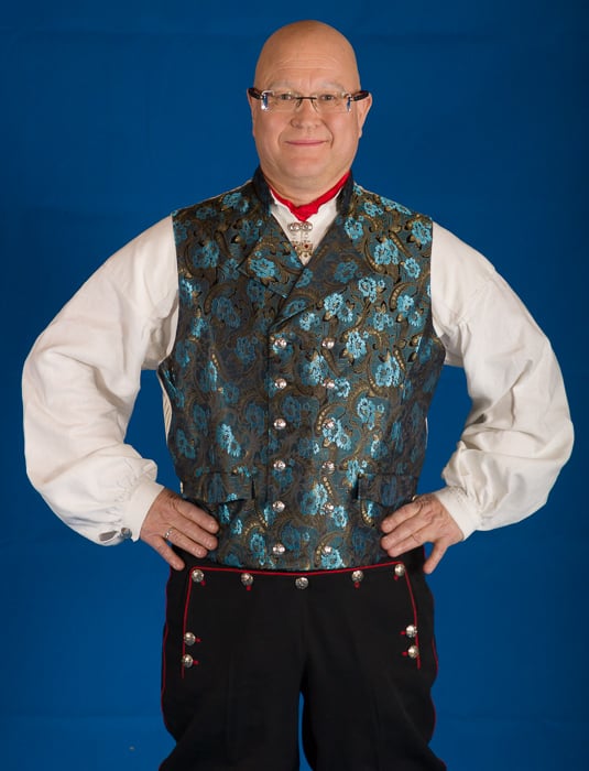 Vest i fransk drapé og silke fra Mekongdalen brukes i herrebunad fra Rogaland