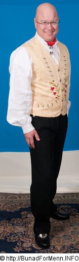 Komplett bunad med jakke, bukse, vest, sølvknapper, mansjettknapper, halsnål, brodert linskjorte, strømper, hosebånd, silkesjerf, broderte bukseseler og bunadspose. Pris fra kr 46.000,- Det eneste du mangler er sko.