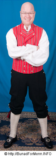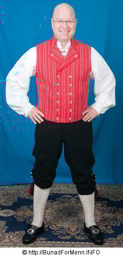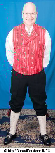 Komplett bunad med jakke, bukse, vest, sølvknapper, mansjettknapper, halsnål, brodert linskjorte, strømper, hosebånd, silkesjerf, broderte bukseseler og bunadspose. Pris fra kr 46.000,- Det eneste du mangler er sko.