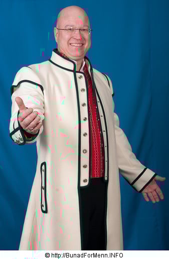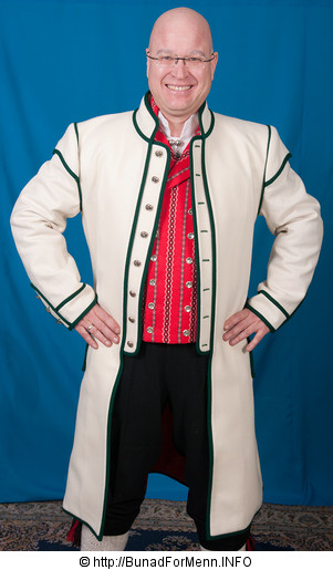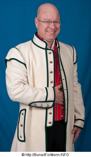 • Mannsbunad fra Østfold med lang hvit frakk med grønne biser