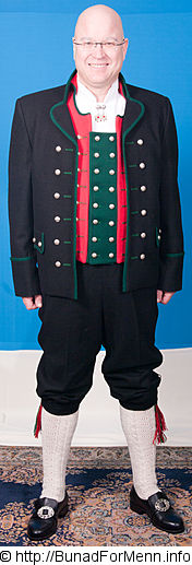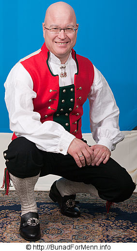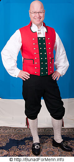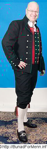 Komplett bunad med jakke, bukse, vest, sølvknapper, mansjettknapper, halsnål, brodert linskjorte, strømper, hosebånd, silkesjerf, broderte bukseseler og bunadspose. Pris fra kr 46.000,- Det eneste du mangler er sko.