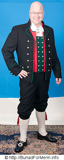 Komplett bunad med jakke, bukse, vest, sølvknapper, mansjettknapper, halsnål, brodert linskjorte, strømper, hosebånd, silkesjerf, broderte bukseseler og bunadspose. Pris fra kr 46.000,- Det eneste du mangler er sko.