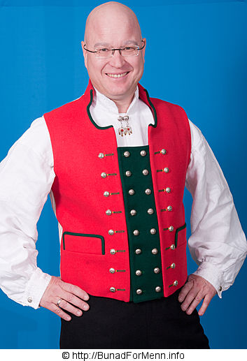 Vesten er rød med innfelt grønt forstykke som skal gi inntrykk av at det benyttes to vester utenpå hverandre. Vesten er dobbeltspent og det er de grønne innfelte delen som kneppes. Knappene og knapphullene på den røde delen er kun til pynt. Den elegante røde utringede ståkragen med grønne kanter er med på å gi bunaden sitt særpreg. Matchende grønne kanter er det også på lommeklaffene. Legg merke til de forseggjorte grønne knapphullene med gule regels. Vesten er laget av et håndvevet materiale. Vi lager ryggen i et håndvevet stripet bomullsstoff. Vesten til Nordhordlandbunaden er laget i grønt eller rødt ullstoff, og brodert med samme mønster som jakken. Bunad For Menn har valgt farge og broderier på vesten med bakgrunn i den opprinnelige Nordhordlandbunaden som fortsatt er i bruk i Nordhordland.