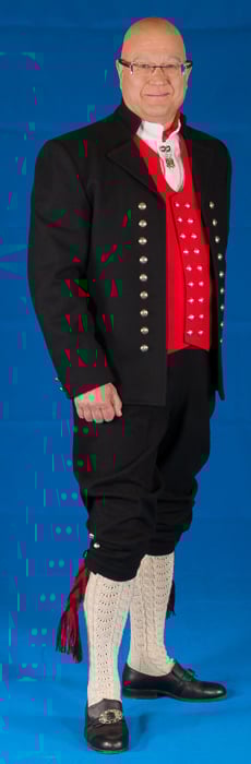 Komplett bunad med jakke, bukse, vest, sølvknapper, mansjettknapper, halsnål, brodert linskjorte, strømper, hosebånd, silkesjerf, broderte bukseseler og bunadspose. Pris fra kr 46.000,- Det eneste du mangler er sko.