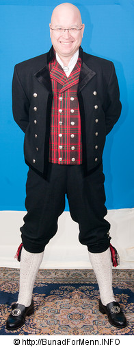 Komplett bunad med jakke, bukse, vest, sølvknapper, mansjettknapper, halsnål, brodert linskjorte, strømper, hosebånd, silkesjerf, broderte bukseseler og bunadspose. Pris fra kr 46.000,- Det eneste du mangler er sko.