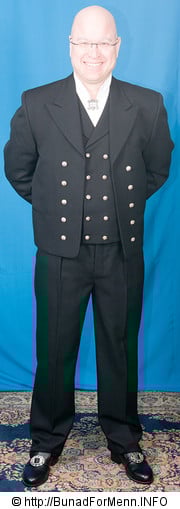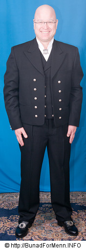 Komplett bunad med jakke, bukse, vest, sølvknapper, mansjettknapper, halsnål, brodert linskjorte, strømper, hosebånd, silkesjerf, broderte bukseseler og bunadspose. Pris fra kr 46.000,- Det eneste du mangler er sko.